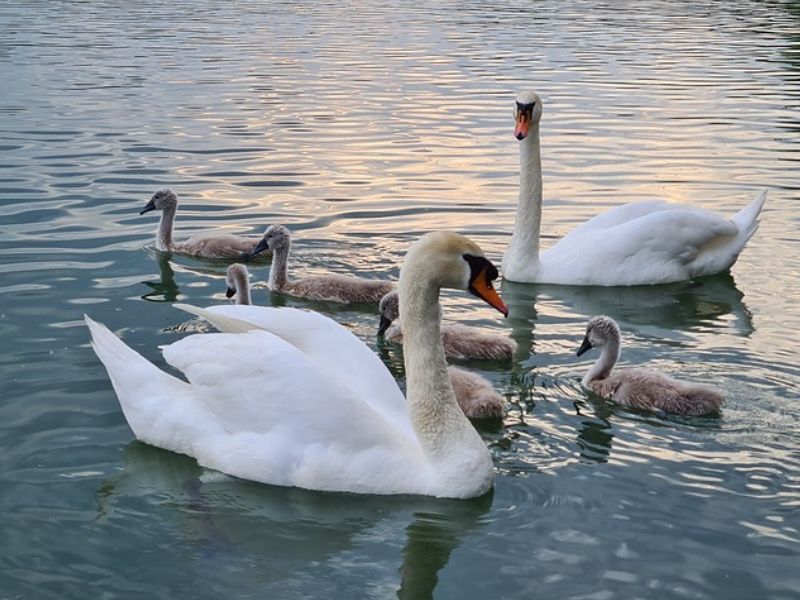 Após a eclosão, os filhotes nascem com uma plumagem acinzentada e, conforme crescem, suas penas vão se transformando, até atingirem a bela plumagem característica dos cisnes adultos.